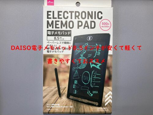 ダイソーでやっとみつけました。 8.5インチの電子メモパッド。価格はダイソーでは高価な部類?の550円(税込み) ペーパーレスで環境にやさしく、繰り返し書いて消せる使用回数はなんと5万回 それがたったの550円。 果たして使い物になるのでしょうか。 開封…